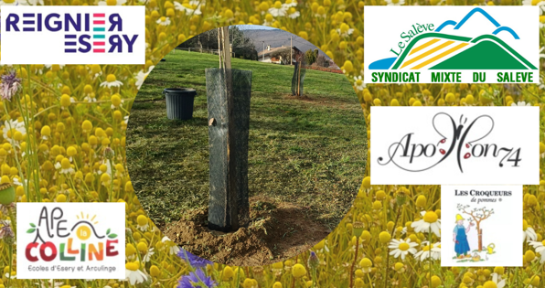 Le Syndicat Mixte du Salève a contribué à cette opération menée par la municipalité avec le soutien des croqueurs de pommes, Appolon 74 et l’APE la colline, avec la plantation de 9 fruitier.